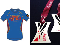 アシックスの提供により、北陸新幹線をイメージした青色を基調に、胸元には金沢駅の"鼓門"や兼六園の"ことじ灯籠"をあしらった参加記念Tシャツを制作。また、"鼓門"をモチーフにした金沢らしいデザイン性の高い完走メダルもお贈りします。⑨ 石川の特産品が当たる「飛び賞」を設定
