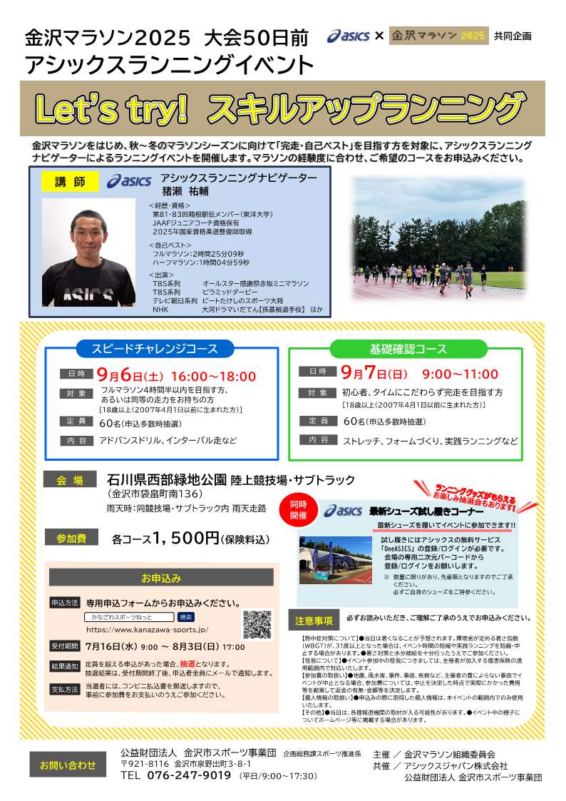 金沢マラソン2025オフィシャルパートナーであるアシックスのランニングナビゲーター が講師を務め、実践的な助言や練習を行います。また、アシックスの最新シューズの試し履きコーナーやお楽しみ抽選会があります!