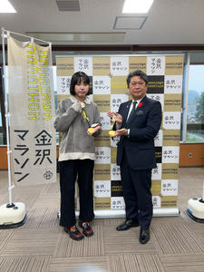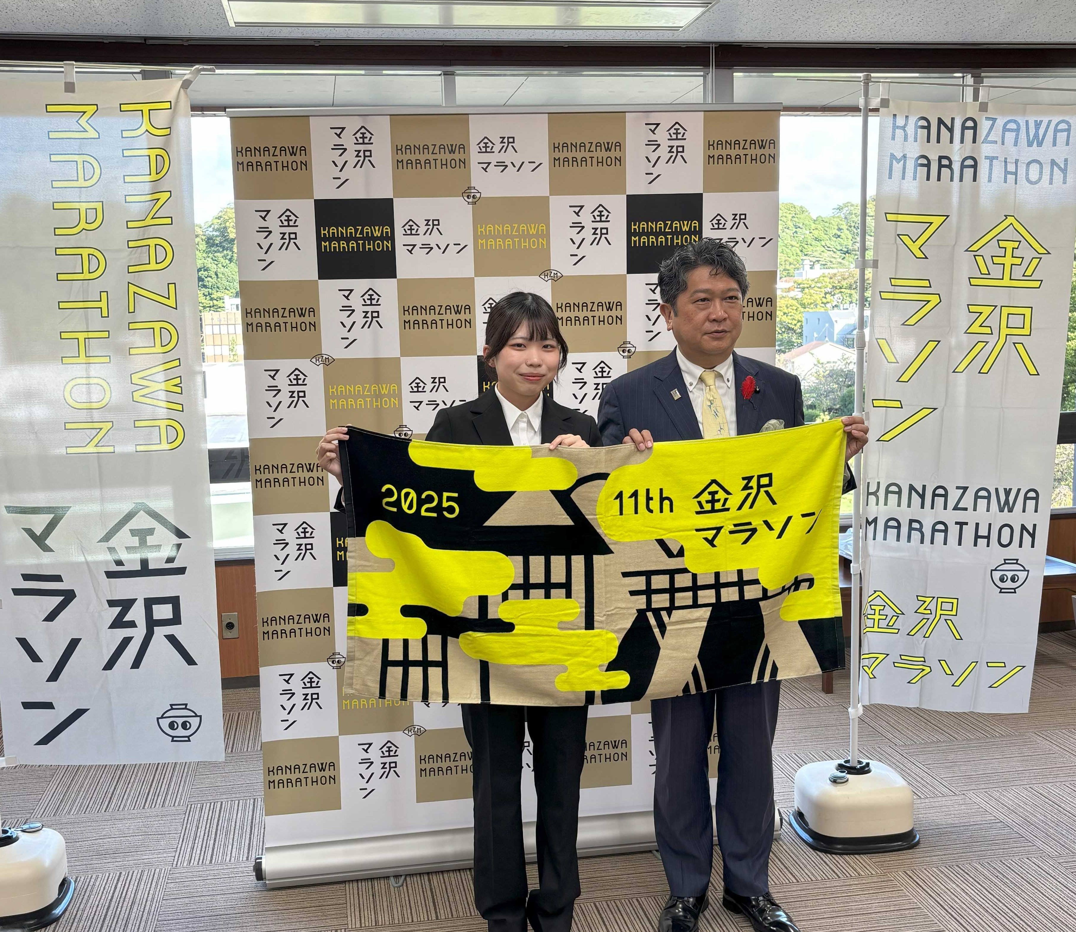 金沢マラソン2025の参加ランナーにお渡しする参加記念タオルのデザインが決定し、10月1日(水)に、村山会長への完成報告会を行いました。