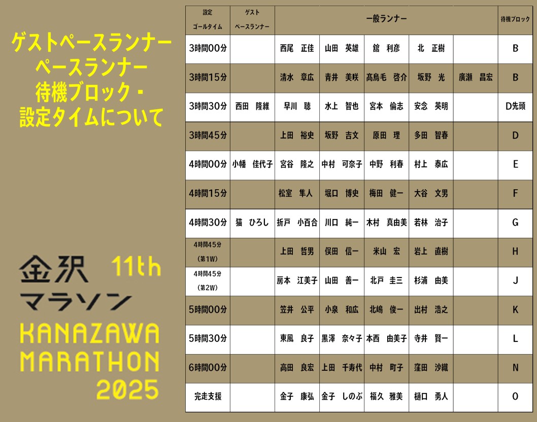 金沢マラソン2025ゲストペースランナー及びペースランナーの待機ブロックと設定タイムについて
