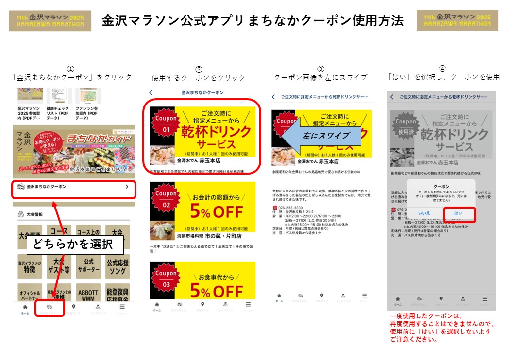 金沢マラソン公式アプリにて、飲食店や伝統工芸・雑貨など全20店舗で使用できる「金沢まちなかクーポン」を配信します。この機会に金沢マラソン公式アプリをダウンロードいただき、お得なクーポンをぜひご利用ください。