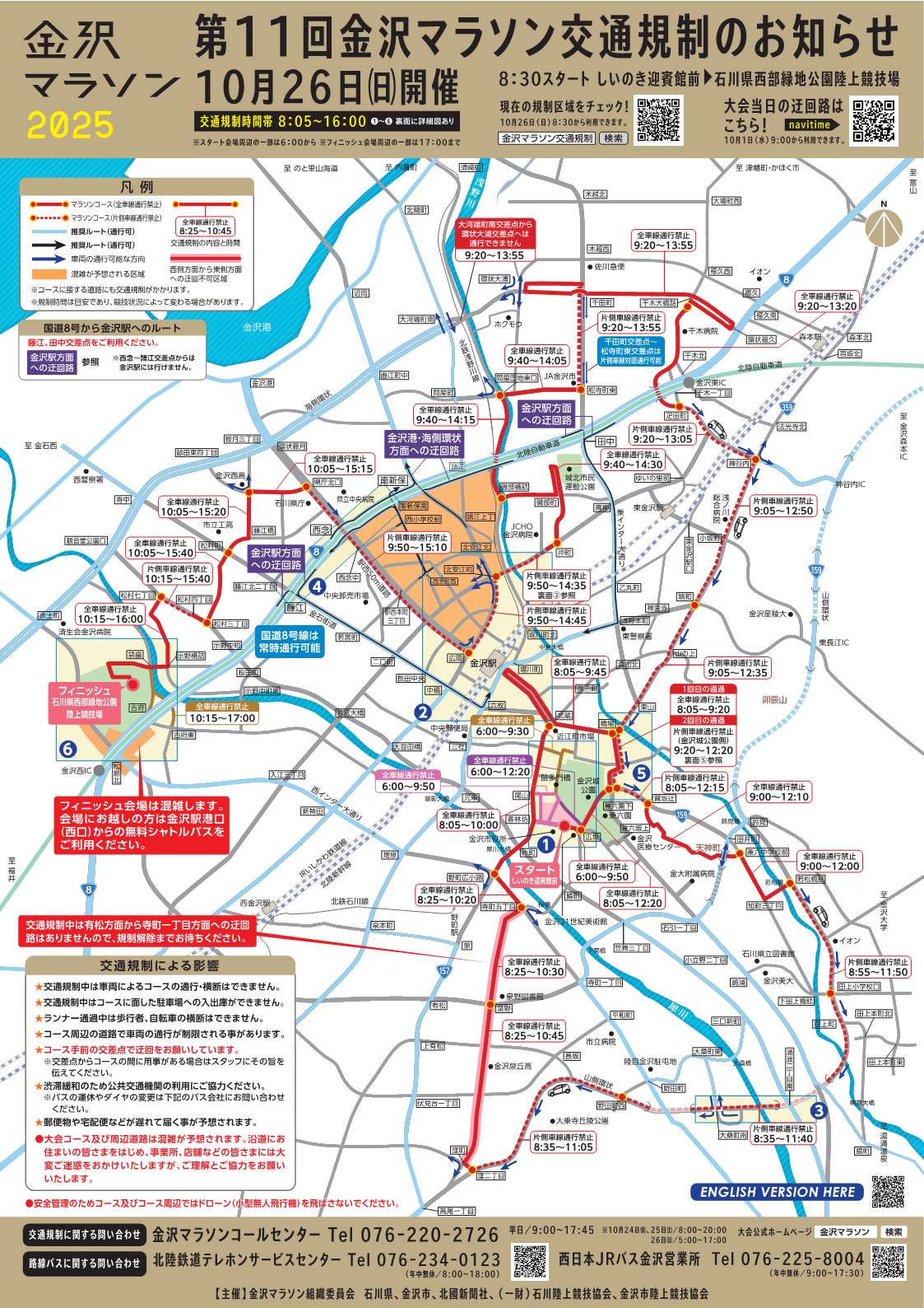 「金沢マラソン2025」の開催に伴い、10月26日(日)は金沢市内で交通規制を実施いたします。ご迷惑をおかけいたしますが、何卒ご理解とご協力をお願いいたします。