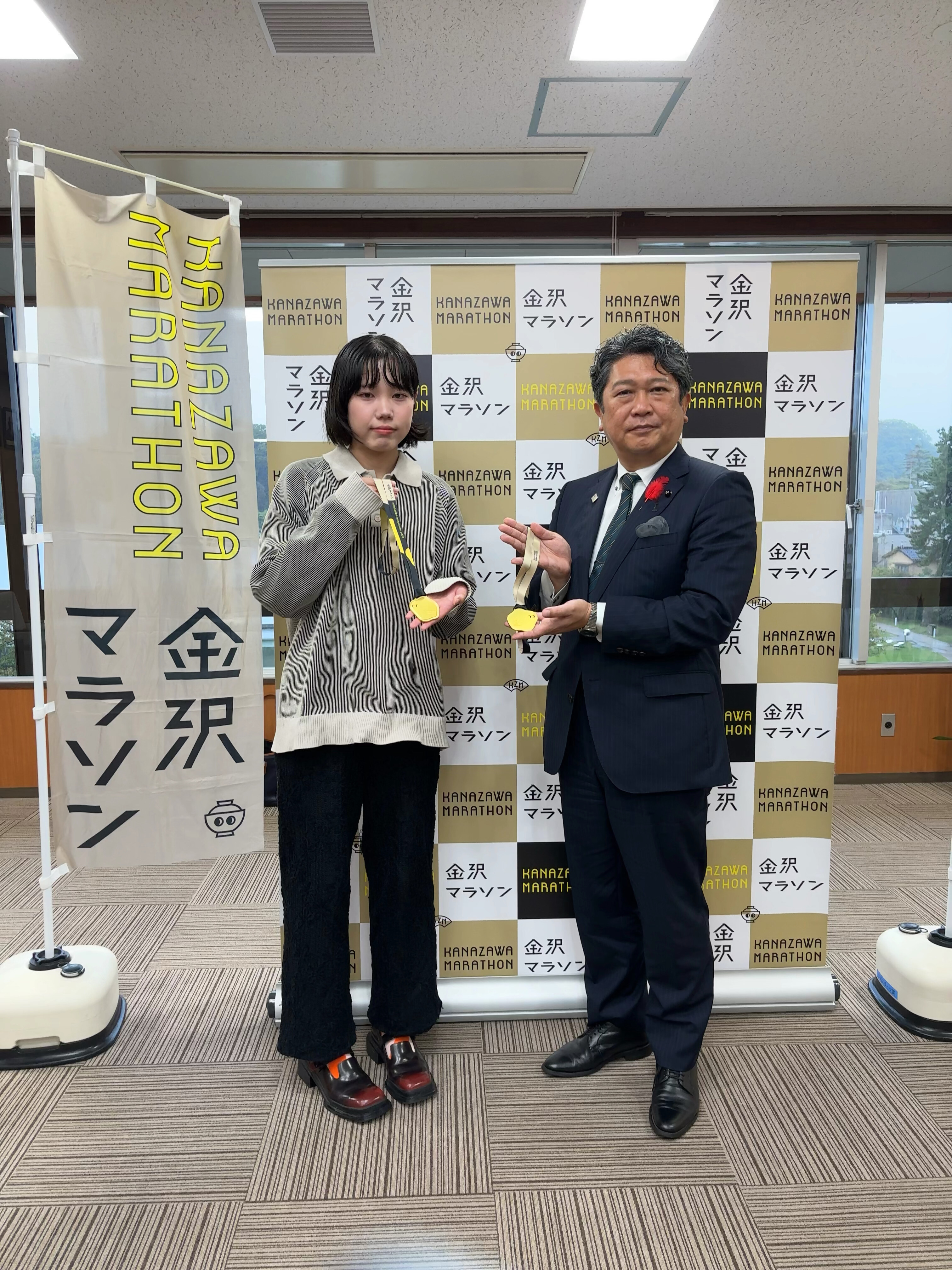 金沢マラソン2025の総合男女1~3位の方に贈呈するオリジナルのトロフィーが完成し、10月8日(水)、村山会長への完成報告会を行いました。