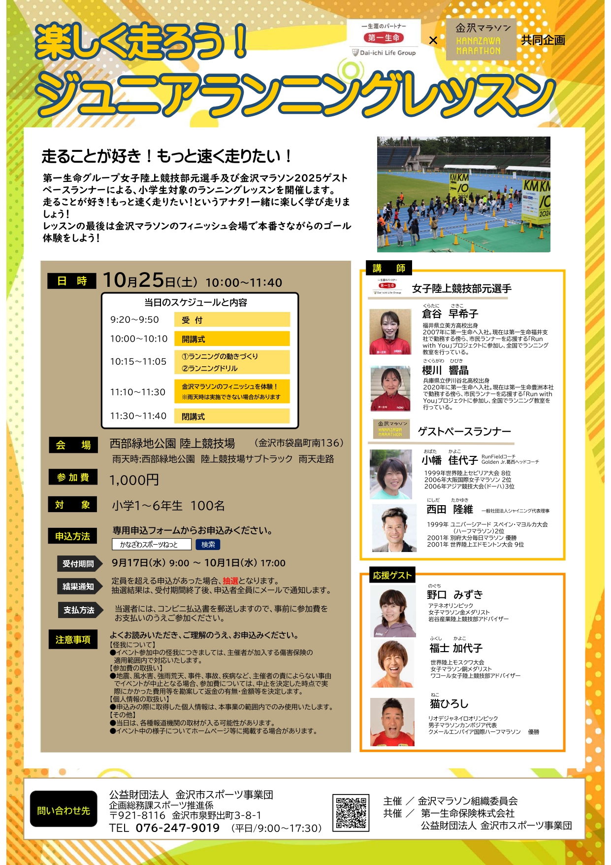 10月25日(土)石川県西部緑地公園陸上競技場で開催する「楽しく走ろう!ジュニアランニングレッスン」の参加者の募集を本日17日(水)から開始しました!