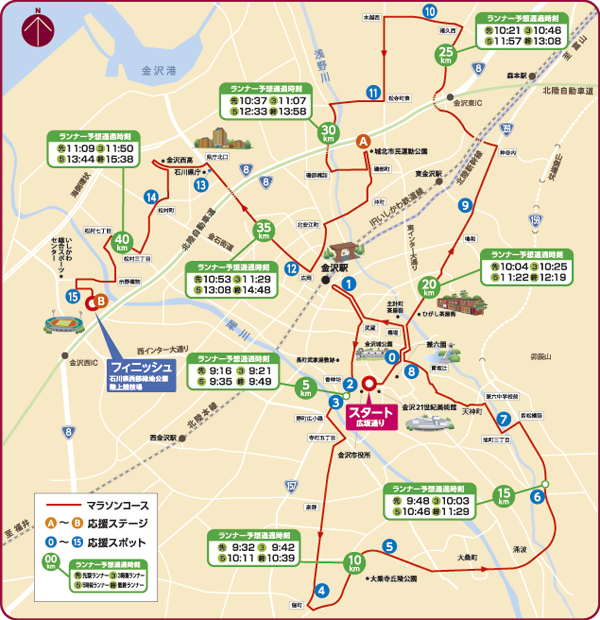 | スタート~10㎞ | テンプスタッフフォーラム㈱ 円光寺山科振興会、チームきらら 金沢工業大学スポーツ考房 片町商店街振興組合 金沢城兼六園商店会 三井住友海上火災保険㈱ 金沢泉丘高校吹奏楽部・合唱部 津田駒工業㈱、高砂大学校同窓会 |