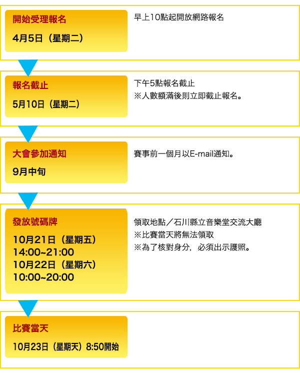 | (1) | 參賽者請留意自身健康狀況,並經過充分的訓練後再參加比賽。另外,參賽前請接受健康檢查,確保身體無任何異常狀況。賽事進行中請依據自身的健康管理,避免以強行的速度前進。又,若於賽時前發現身體有異,請不要出賽。 |