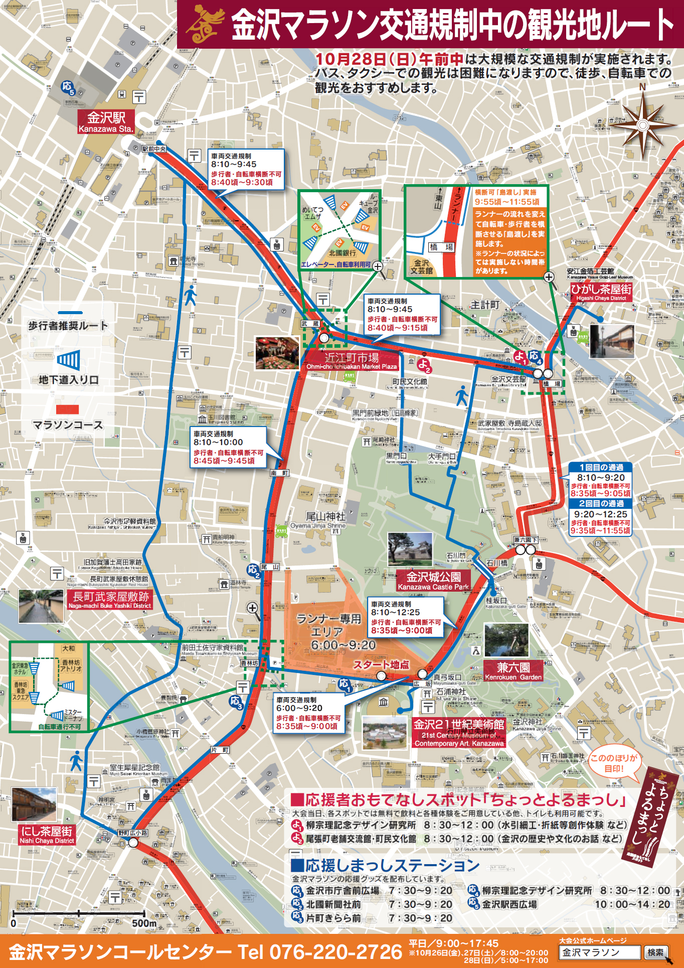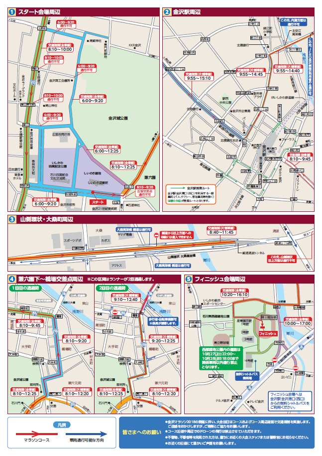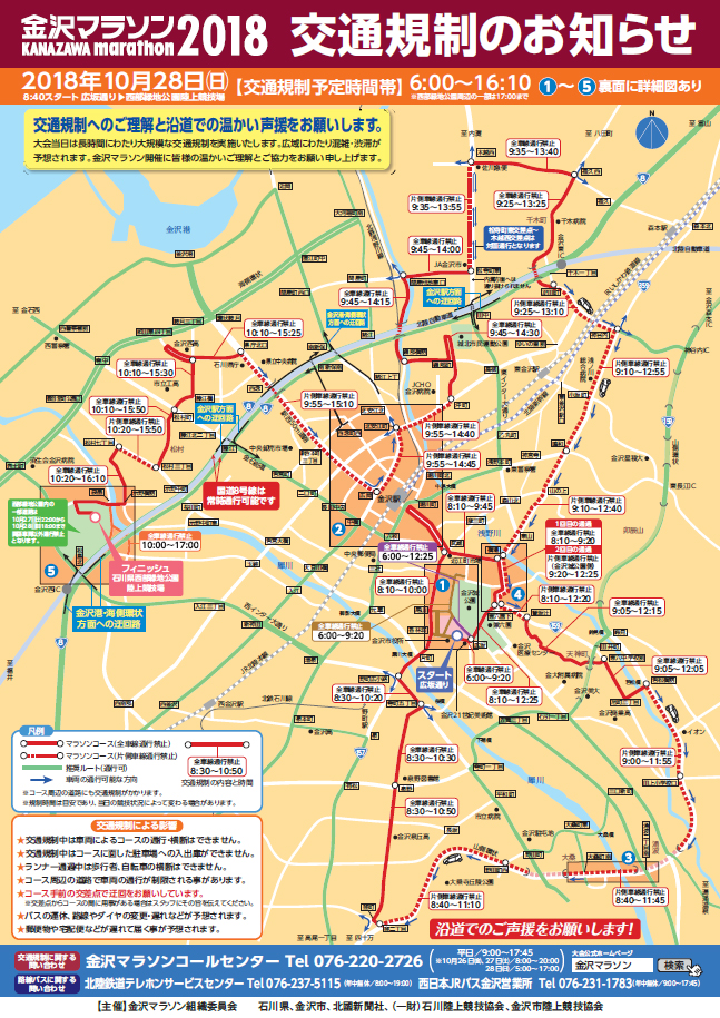 2018年10月28日(日)は「金沢マラソン2018」の開催に伴い、長時間にわたり大規模な交通規制を行いますので、 金沢市内全域で大規模な交通渋滞が予想されます。