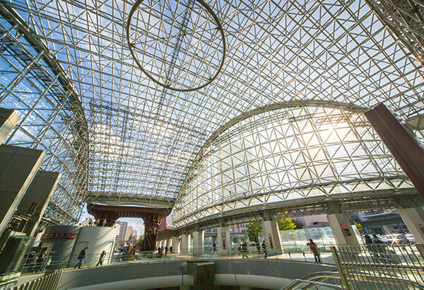 世界で最も美しい駅14駅の1つに選出されている金沢駅。もてなしドームは雨や雪が多いため「駅を降りた人に傘を差し出すおもてなしの心」をコンセプトに誕生。幾何学模様のガラスの天井が毎年金沢を訪れるランナーの皆様をやさしく迎えてくれます。金沢の伝統芸能である能楽で使われる鼓をイメージした荘厳な印象の鼓門(つづみもん)はフォトスポットとしても人気です。