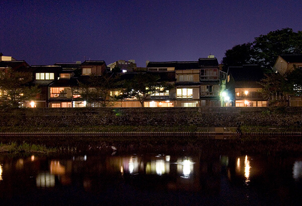 浅野川沿いに昔ながらの風情ある料理屋や茶屋が立ち並ぶ主計町茶屋街。昼間でも薄暗い石段が続く「暗がり坂」や、作家・五木寛之氏が命名した「あかり坂」では、趣のある風景に出会えます。夕暮れ時になると、芸妓が奏でる三味線と太鼓の音が聞こえてきて情緒あふれる雰囲気に包まれます。夜の街灯の明かりと、格子戸から漏れる光に浮かぶ街並みはどこか魅惑的です。