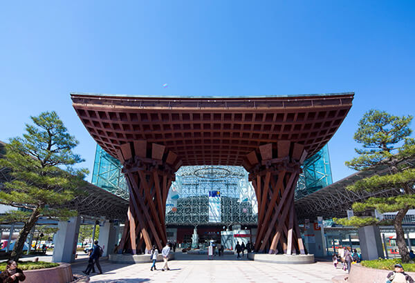 世界で最も美しい駅14駅の1つに選出されている金沢駅。もてなしドームは雨や雪が多いため「駅を降りた人に傘を差し出すおもてなしの心」をコンセプトに誕生。幾何学模様のガラスの天井が毎年金沢を訪れるランナーの皆様をやさしく迎えてくれます。金沢の伝統芸能である能楽で使われる鼓をイメージした荘厳な印象の鼓門(つづみもん)はフォトスポットとしても人気です。