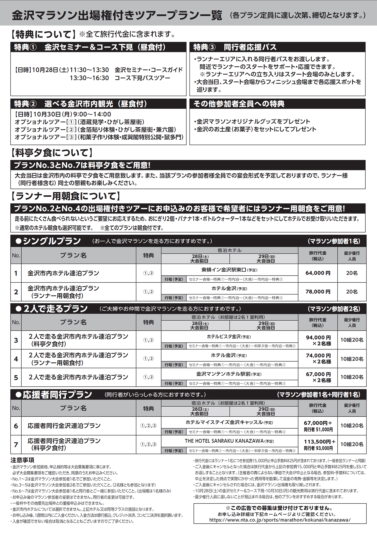 抽選なしで大会に参加できるツアーをご用意しました。マラソンだけではなく、グルメ、自然、文化など、金沢や石川をまるごと堪能したいランナーにうってつけの2泊3日の旅行プランです。 また、ご家族やご友人なども楽しめる応援者同行プランもあります。今年は、定番プランのほか、料亭夕食付プランを設けました。皆さま是非お申し込みください。