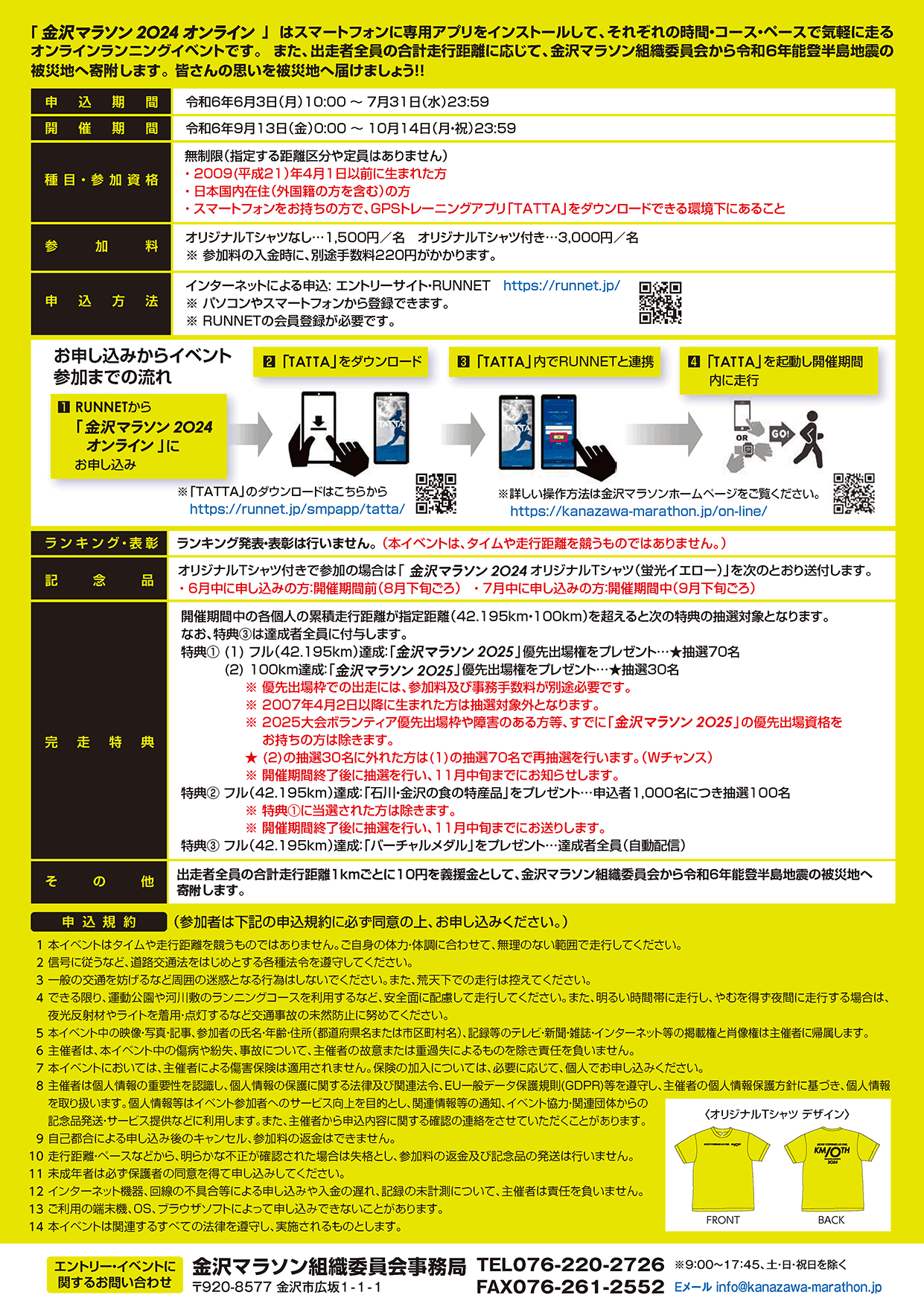 出走者全員の合計走行距離1kmごとに10円を義援金として、金沢マラソン組織委員会から令和6年能登半島地震の被災地へ寄付します。