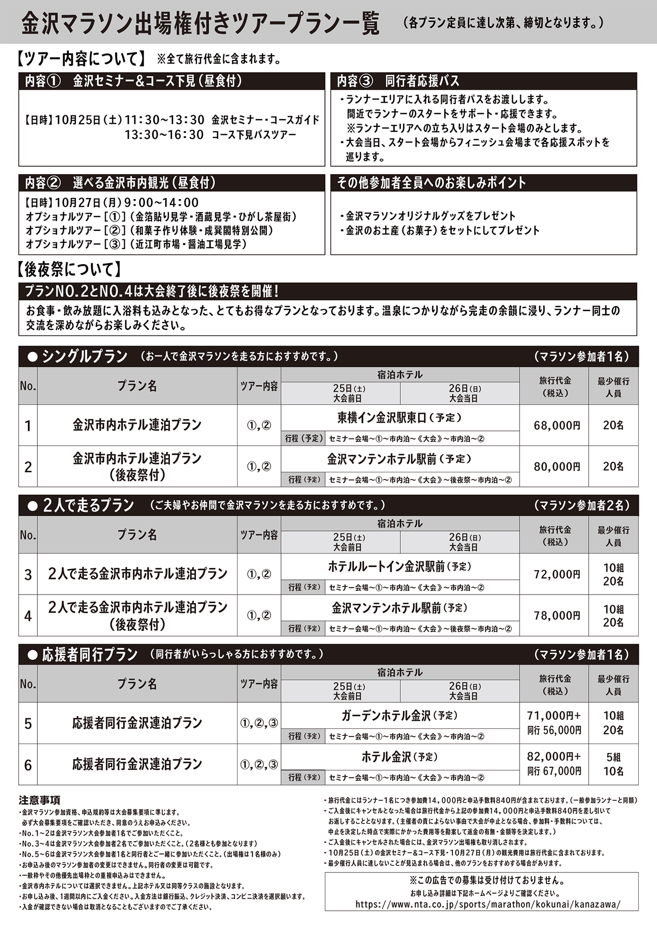 抽選なしで大会に参加できるツアーをご用意しました。マラソンだけではなく、グルメ、自然、文化など、金沢や石川をまるごと堪能したいランナーにうってつけの2泊3日の旅行プランです。 また、ご家族やご友人なども楽しめる応援者同行プランもあります。