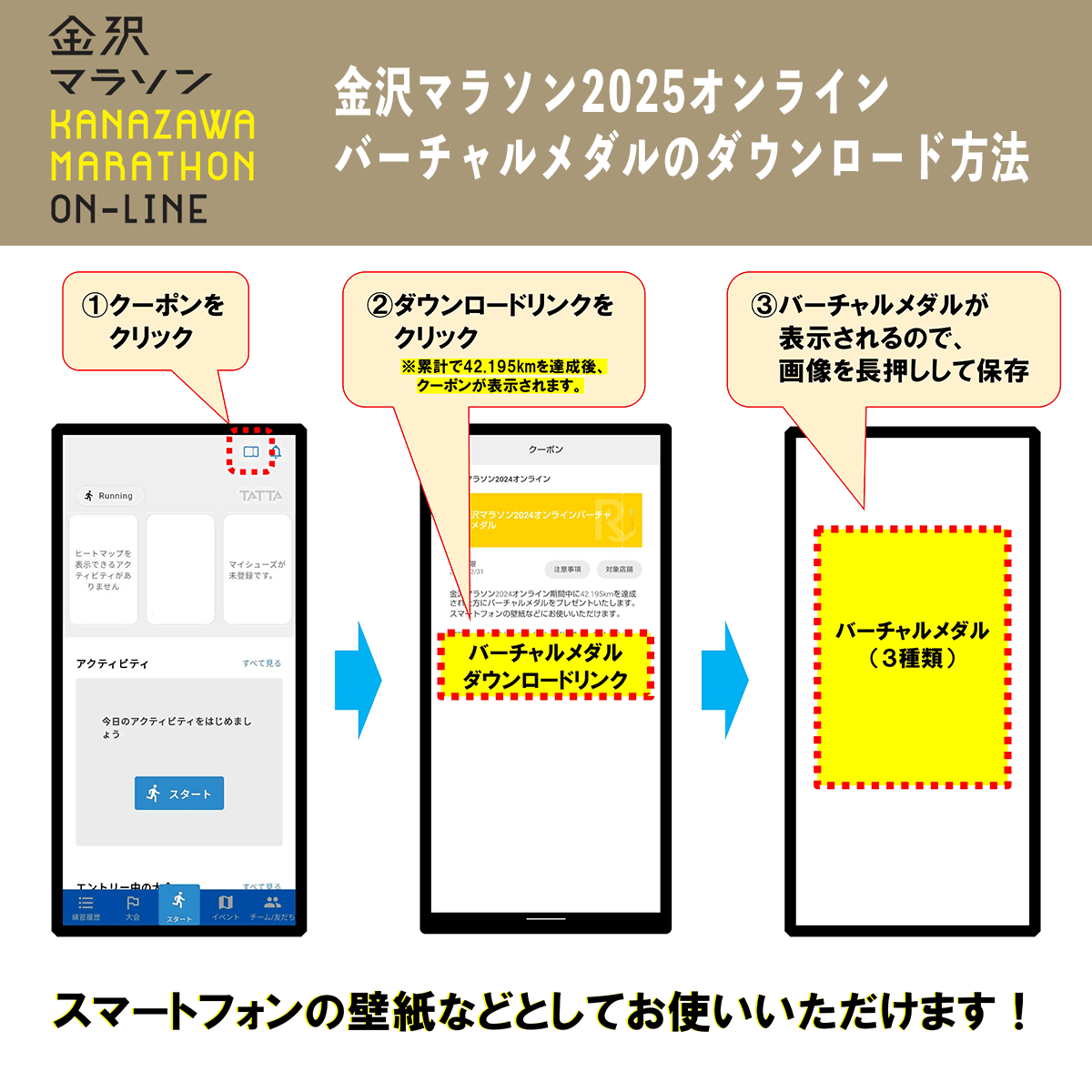 - 累計でフルマラソン(42.195km)を走られた方は、「TATTA」内でバーチャルフィニッシャーメダルをダウンロードすることができます。