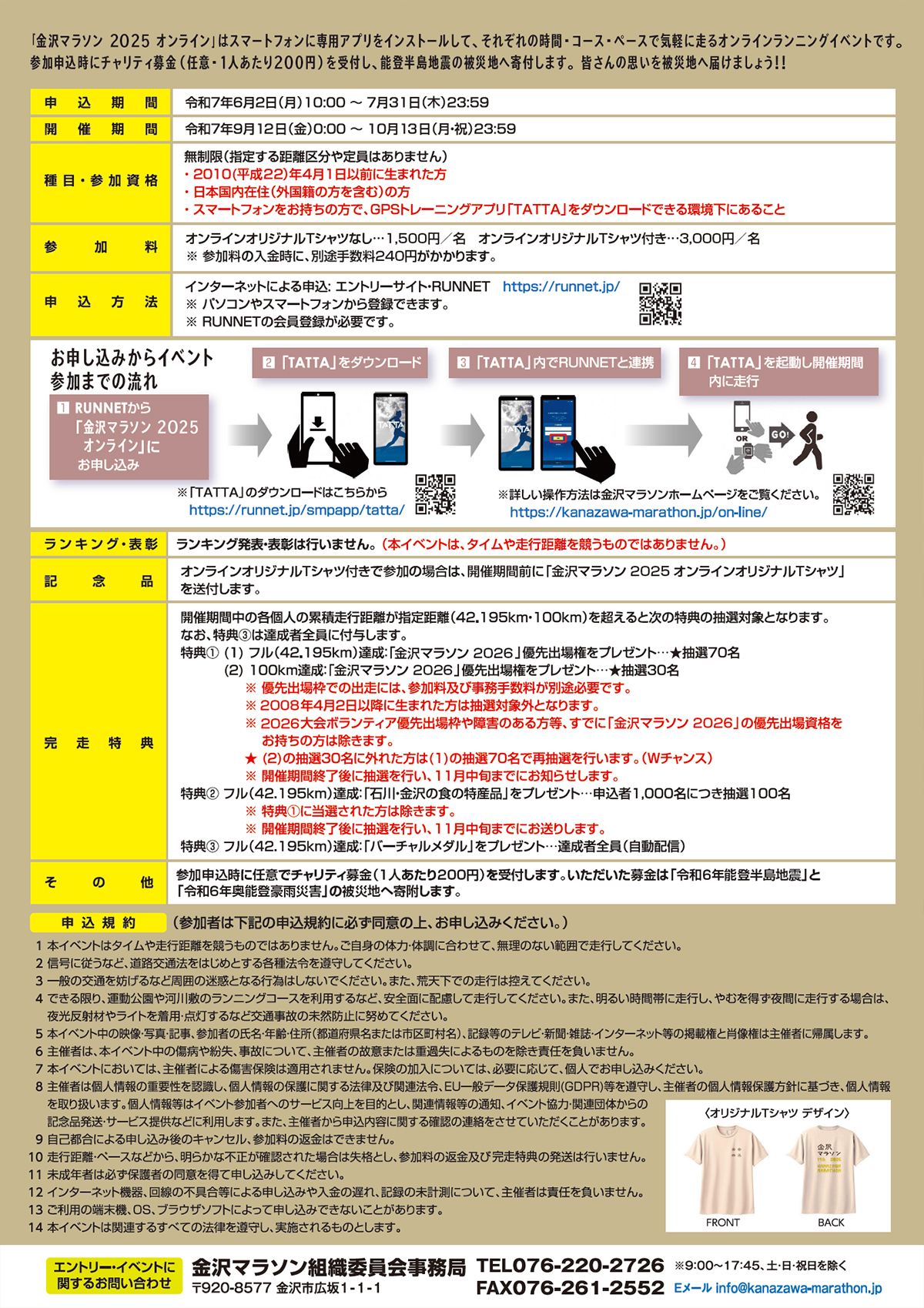 オリジナルTシャツ付きで参加の場合は、開催期間前に「金沢マラソン2025 オンラインオリジナルTシャツ」を送付します。
