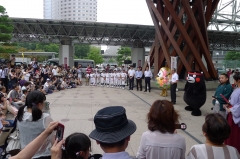 7月30日(木)14時、金沢駅もてなしドームに熊本県のキャラクター「くまモン」が登場しました。くまモンは熊本城マラソンキャラバン隊として金沢マラソンを表敬訪問し、激励を行いました。約300人の観客が見まもる中、激励式典が行われ、石川県のキャラクター「ひゃくまんさん」との記念品Tシャツの交換をし、エールを送り合いました。