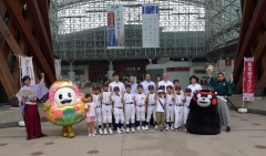 また両大会のPRタイムも設けられ、熊本城マラソンはくまモンによる「くまモン体操」や、熊本城おもてなし武将隊による口上にて熊本の魅力を紹介しました。金沢マラソンのPRタイムでは、「沿道にぎやかし隊」を代表して金沢市学童野球連盟に所属する「中央スターズ」のメンバーが出演し、主将の幸野晃大(こうの こうだい)君が選手宣誓にて大会当日の元気な沿道応援を決意表明しました。