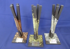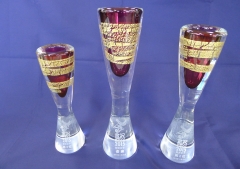 金沢駅の鼓門をモチーフとし、吹きガラスで作り上げる柔らかな形に仕上げました。色は、金で発色させるゴールドルビーの色の周りに金箔をあしらい、金沢の華やかさを表現しています。