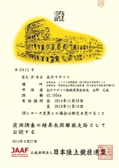 開催1年前を迎える金沢マラソンに対して、11月12日付で日本陸上競技連盟より金沢マラソンコースの「公認コース認定書」が送付されました。今年の8月下旬に日本陸上競技連盟から派遣された3名の計測員が自転車でコース計測を行い、公認基準を検証し、公認コースとして認定されることとなりました。